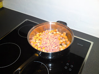 Det hele blev stegt sammen til en fantastisk klistret og tung sovs, krydret med tomat puré, paprika, salt, peber og løg…