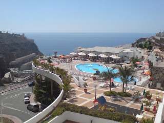 Turen gik derned fredag morgen med fly fra Kastrup 7:30. For at nå flyet til tiden måtte vi dog tage toget fra Sønderborg allerede torsdag aften så vi nåede op på 14 timers rejse. Det var dog alle strabadserne værd da vi først kom derned. Hotellet var en dejligt 4 stjernet hotel med pool og alt hvad dertil hører. Vi havde booket en lille lejlighed med 2 værelser, et lille køkken og bad og det var sådan set rigeligt. Vi fik også en fin lille altan hvor vi kunne sidde og kigge ud over poolområdet og ned til havet: