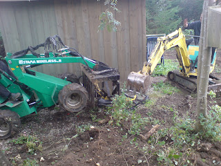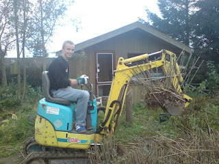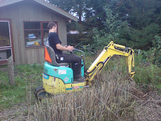 Alco og Thorge var de første til at springe ud af sengen og de blev sendt ind til Rabøl for at hente de maskiner vi havde lejet. En minigraver og en motordrevet trillebør skulle lette vores arbejde, og det kan man roligt sige de gjorde.